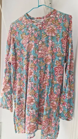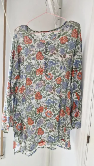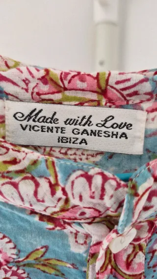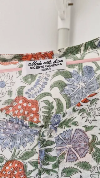 Camisa con un diseño floral vibrante y un toque artesanal. - Estampado floral en tonos azules y rosas. - Detalle Made with Love en la etiqueta. - Fabricada en Ibiza.