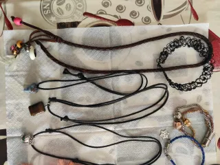 Lote de collares y pulseras con diversos diseños. - Incluye gargantillas, collares largos y pulseras. - Diseños con abalorios, cadenas y detalles. - Variedad de estilos para complementar tu look.