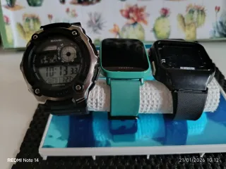 Conjunto de tres relojes, todos en funcionamiento.msrca xaomi bip u verde Funciona y bien de batería.skmei.nuevo con plásticos aún puestos..reloj geonaute correa no original y pila puesta hace poco. - Un reloj con correa negra. - Un reloj con correa verde. - Un reloj con correa negra.