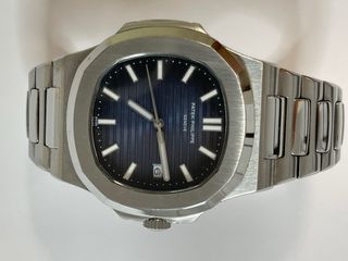 Reloj Patek Philippe Nautilus con esfera azul. - Caja y brazalete de acero inoxidable. - Diseño deportivo y elegante.