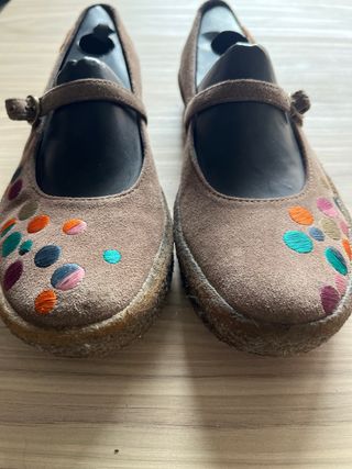 Zapatos planos de la marca Camper en talla 36. Presentan un diseño original con apliques de círculos multicolores. - Material exterior de ante. - Cierre con tira y hebilla. - Detalle de bordado de círculos en la puntera.