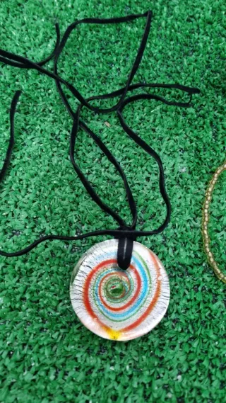 Collar con un colgante circular de cristal con un diseño de espiral multicolor. El cordón es de terciopelo negro. - Colgante de cristal. - Diseño de espiral. - Cordón de terciopelo negro.