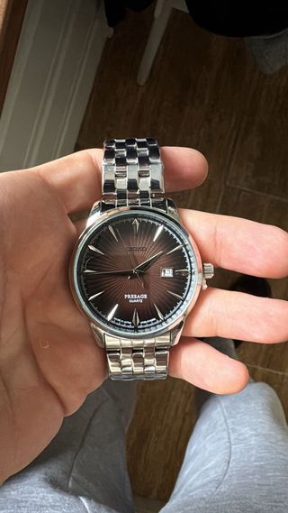 Elegante reloj Seiko con esfera marrón y detalles plateados. - Diseño con patrón radial en la esfera. - Indicador de fecha. - Correa de eslabones plateada.