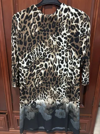 Vestido con estampado de leopardo y detalle floral en el bajo. - Diseño con drapeado en la parte delantera. - Manga tres cuartos. - Bajo con estampado floral degradado.