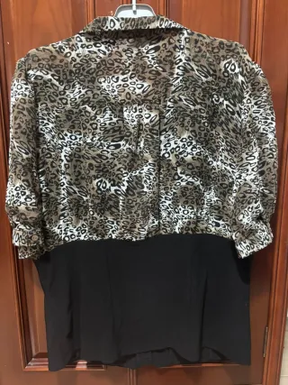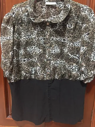 Camisa con estampado de leopardo y cuello redondo. - Mangas abullonadas. - Cierre de botones. - Detalle de cinturón negro.