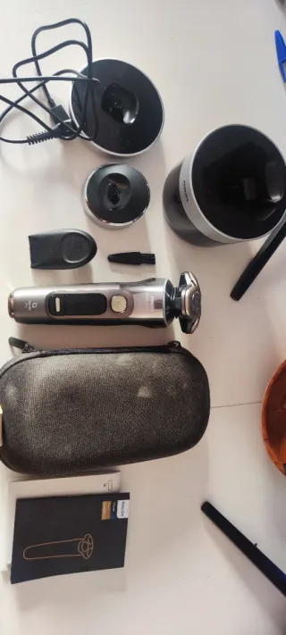Afeitadora eléctrica Philips i9000 Prestige Ultra en color negro y plateado. Incluye accesorios y estuche. Usado solo 1 vez. No llego a convencerme. NO incluye caja. Se compró en Reyes y al ser un regalo se tiró 🤦 - Cabezal de afeitado flexible. - Cuchillas de alta precisión. - Base de carga. - Recortador de precisión. - Cepillo de limpieza. - Soporte limpiador