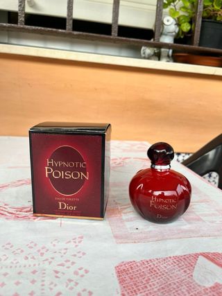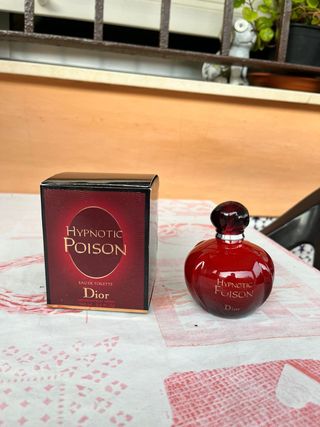 Frasco de perfume Dior Hypnotic Poison Eau de Toilette. - Fragancia en presentación de 100 ml. - Envase de vidrio rojo con tapa. - Caja a juego con diseño distintivo.