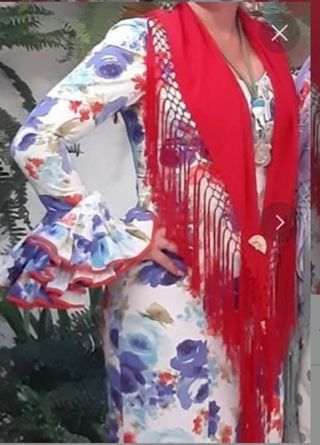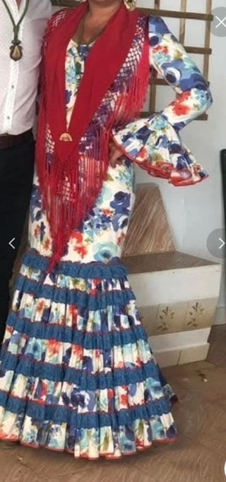 Traje de flamenca de la marca Manuela Macias, talla M-L. Un estampado azul y rojo sobre fondo blanco - Mangas largas con volantes. - Falda larga con múltiples volantes. - Escote en pico Las medidas son: pecho 44, cintura 40 y cadera 48 cm. Tiene para sacar un poco en cada pinza