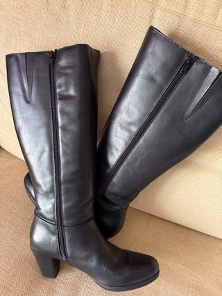 Elegantes botas de caña alta fabricadas en piel. Botas de caña alta en color negro. Piel, made in Spain, comprado en zapatería local, suela de goma. 7 cm tacón, 37 de pierna hasta el tacón y 18 de contorno con elástico por arriba. - Cierre con cremallera lateral. - Tacón grueso para mayor comodidad. - Diseño clásico y versátil.