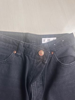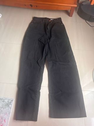 Vaqueros negros con un estilo desgastado. - Corte ancho. - Cintura alta. - Cierre de cremallera y botón.