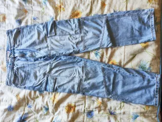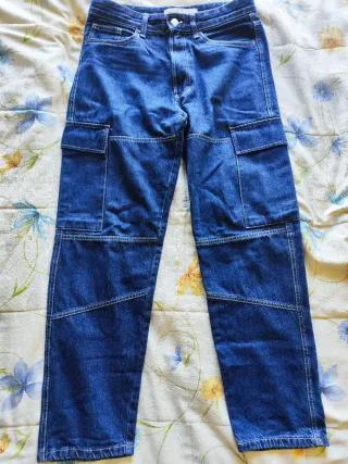 Pantalones cargo de la marca Bershka en color azul. Talla M. - Cierre de botón y cremallera. - Bolsillos cargo laterales. - Diseño moderno y cómodo.