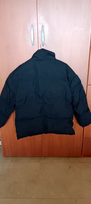 Chaquetón reversible de color negro con detalles interiores en blanco. Presenta un diseño moderno y versátil. Nuevo, sin estrenar y con etiqueta. Con gran relleno. - Cuello alto. - Cierre de cremallera. - Bolsillos laterales. En ambas caras Tallas 38/40