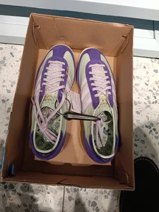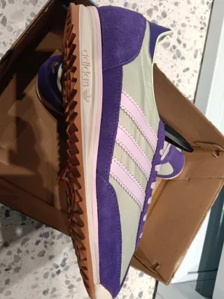 Tênis Adidas com um design moderno e cores vibrantes. - Combinação de roxo e verde. - Cadarços em tom pastel. - Detalhes dourados no logo.