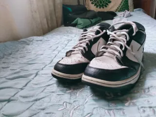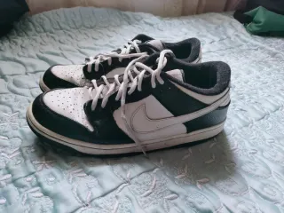 Zapatillas deportivas Nike Dunk Low en talla 42. Combinan cuero blanco y negro para un estilo clásico. - Diseño icónico de Nike. - Cierre con cordones blancos. - Suela de goma duradera.