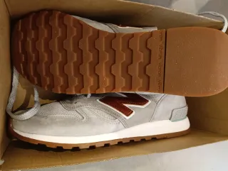 Tênis New Balance em camurça e malha. - Design moderno em tons de cinza e marrom. - Solado de borracha com padrão de tração. - Detalhes em couro. - Cadarços na cor cinza.