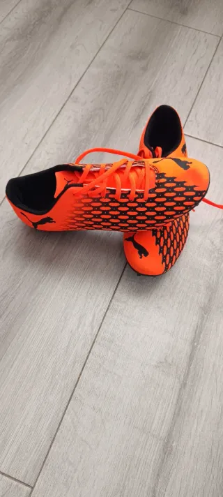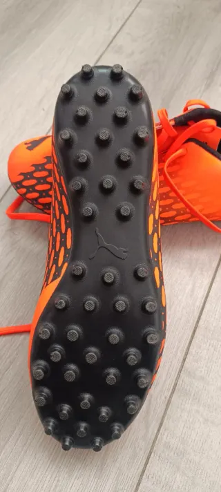 Zapatillas de fútbol con tacos, ideales para jugar en césped. - Diseño llamativo en color naranja. - Detalle de patrón hexagonal en negro. - Logo de Puma en los laterales.