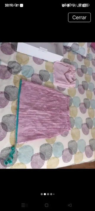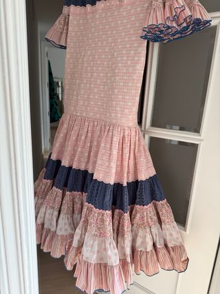 Traje de flamenca de la marca Manuela Macias. - Talla 40. - Diseño con volantes en las mangas y falda. - Tejido principal en color rosa con estampado. - Detalles en tejido azul. - Adornos de encaje y volantes en contraste.