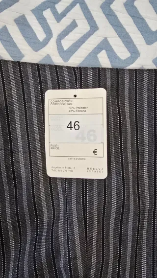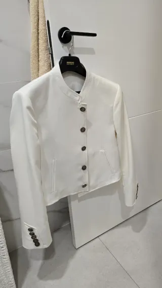 Chalequillo y chaquetilla tono hueso con botonadura de monedas de plata, talla 56. (Se vende suelto en 150€) Pantalon de vuelta blanca gris con raya gruesa, elástico, par caballista, talla 46 (se vende suelto en 60€)