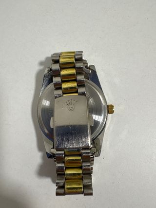 Elegante reloj de pulsera con detalles en oro y una esfera púrpura. - Bisel con incrustaciones. - Brazalete bicolor de eslabones.