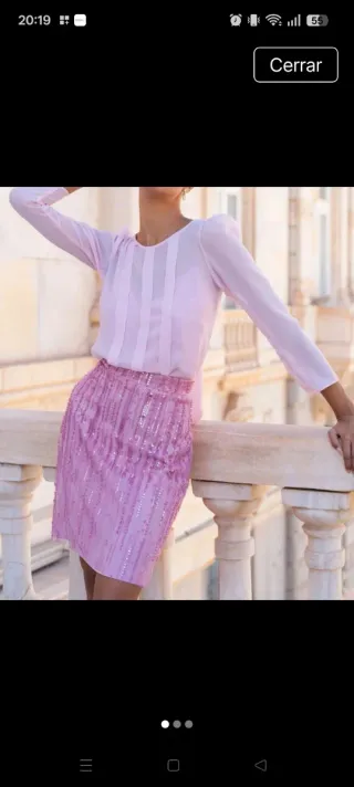 Conjunto de dos piezas de la marca Silvia Navarro. - Blusa de manga larga en color rosa pálido con detalles plisados en el delantero. - Falda corta de corte recto, adornada con lentejuelas y abalorios en tono rosa.