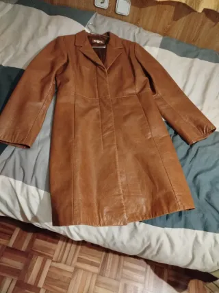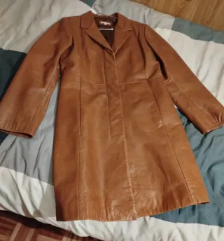 Abrigo de piel de color marrón, ideal para añadir un toque elegante a tu vestuario. - Diseño clásico con cuello. - Cierre frontal.
