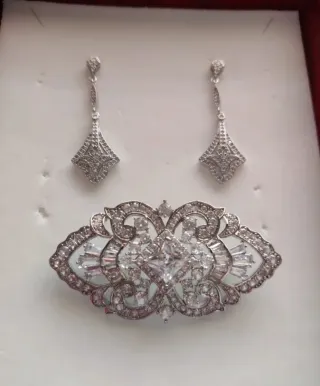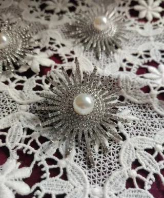 Precioso conjunto de tres broches con diseño de estrella y perla central. Perfecto para imagen de virgen dolorosa o gloria a tamaño natural. Se pueden comprar individualmente. Medidas: 5'5 cm. - Diseño de estrella con múltiples detalles. - Perla sintética en el centro. - Acabado plateado brillante.