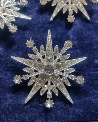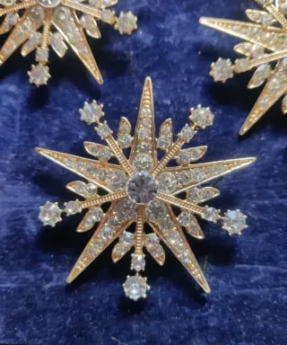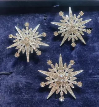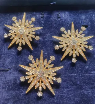Conjunto de tres broches con diseño de estrella y perla central. Perfecto para imagen de virgen dolorosa o gloria a tamaño natural. Se pueden comprar individualmente. Medidas: 5'5 cm. - Diseño de estrella con múltiples detalles. - Perla sintética en el centro. - Acabado plateado brillante.