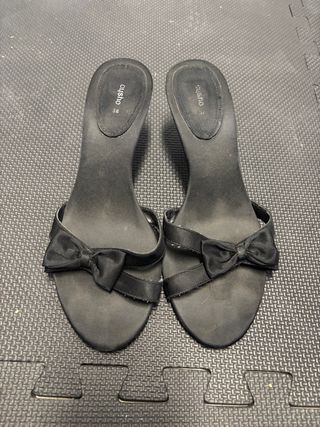 Chanclas de la marca Oysho, talla 38, en color negro. - Diseño con tira frontal adornada con lazo. - Tacón fino.
