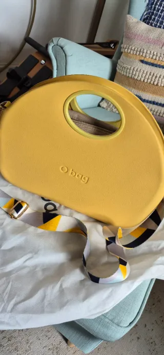 Bolso de la marca O bag en llamativo color amarillo. Incluye una correa con un diseño geométrico y colorido. - Correa ajustable con estampado geométrico. - Cierre de cremallera. - Bolsillo interior. - Incluye bolsa de tela para guardarlo.