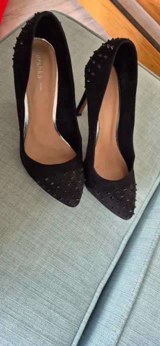 Elegantes zapatos de tacón alto con un diseño moderno. - Acabado en ante. - Detalle de tachuelas metálicas en punta y borde. - Marca: Bershka.