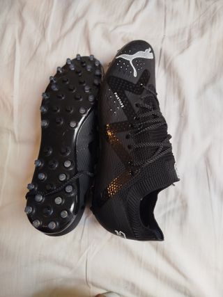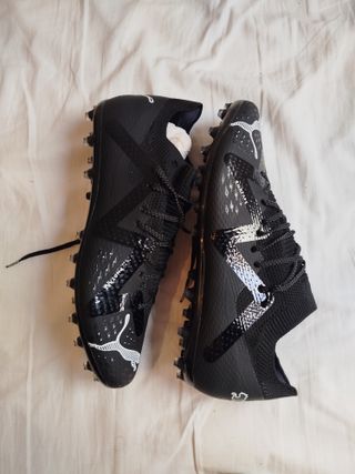 Botas de fútbol Puma con un diseño moderno y llamativo. - Color principal negro con detalles plateados. - Cierre de cordones. - Suela con tacos para césped.