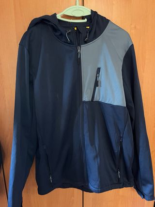 Sudadera con capucha y cremallera completa, combinando paneles de dos colores. - Diseño con paneles en azul marino y gris. - Cremallera frontal. - Bolsillos con cremallera.