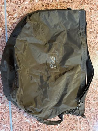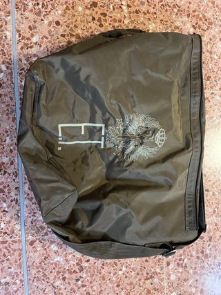 Mochila de color marrón con un diseño distintivo. - Asa superior. - Correa ajustable para llevar al hombro. - Detalle de un escudo con águila y corona.