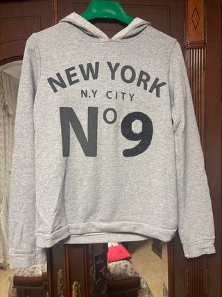 Sudadera gris con estampado de New York N°9. - Diseño con capucha. - Estampado frontal. - Manga larga. -PRECIO NEGOCIABLE.