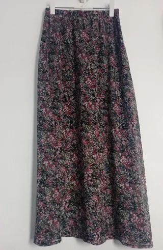 Falda larga con forro hasta la rodilla. Cintura de goma. Caída. No hace falta plachar