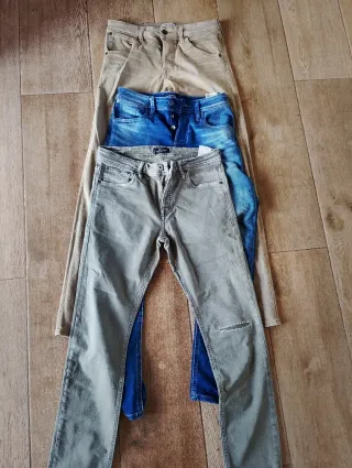 Lote de tres pantalones vaqueros de la marca Jack&Jones. Talla 42, sería M - Unos vaqueros en color beige. - Unos vaqueros en color azul. - Unos vaqueros rotos en color verde oliva. Excelente estado, se quedaron pequeños muy rápido, lo llevaba con 1,78m y 72 kgs.