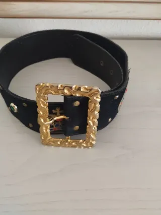 Elegante cinturón negro con detalles y una llamativa hebilla dorada. - Hebilla cuadrada con diseño labrado. - Adornado con piedras de colores y coronas - Material de ante y cuero _ Mide de largo 80 cm.