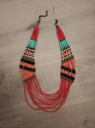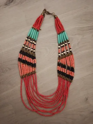 Elegante collar de cuentas con un diseño multicapa y un estilo étnico. - Cuentas de coral y turquesa. - Detalles en negro y blanco. - Cierre de mosquetón.