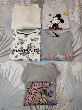 Conjunto de cinco sudaderas para mujer, perfecto para combinar con cualquier estilo, prenda. - Una sudadera blanca lisa. - Una sudadera gris con estampado de Mickey Mouse. - Una sudadera blanca con estampado floral y texto MERMAID. - Una sudadera gris con estampado floral. - Una sudadera gris con estampado de texto Things for the Better en multicolor.(esta tiene una marca en la manga, ver fotos)