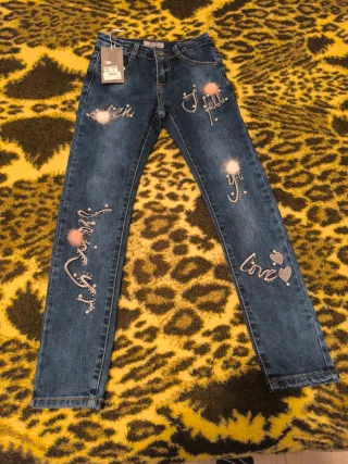 Pantalón vaquero con adornos para niña. - Diseño con pedrería y pompones. - Estilo moderno y divertido.