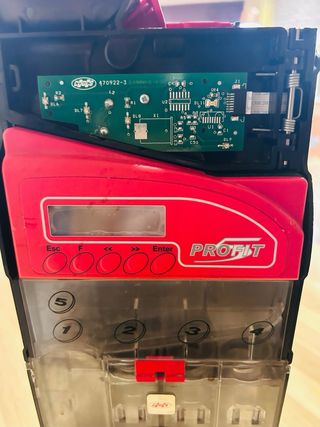 Monedero COGES PROFIT en color negro y rojo. - Diseño compacto y funcional. - Pantalla digital integrada. - Botones de control. Esta dando fallo, pero cuando apagas la maquina y hace reset va perfecto