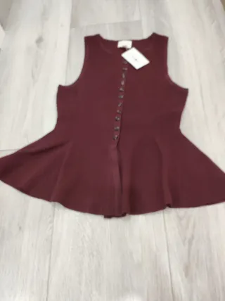 Chaleco de punto con botones frontales y corte acampanado. COLOR BURDEOS - Diseño sin mangas. - Cuello redondo. - Cierre de botones. - Bajo con vuelo.