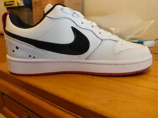Zapatillas deportivas Nike Court Borough Low 2 Blancas con Swoosh Negro brillante y detalles en rosa. - Diseño bajo con detalles en negro. - Cierre de cordones. - Suela de goma.