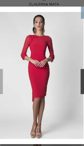 Elegante vestido de fiesta de Claudina Mata. - Color rojo vibrante. - Diseño de manga larga con detalles de encaje. - Corte entallado. - Escote redondo. Aparece talla 42 en el vestido pero me lo hicieron para una talla 38