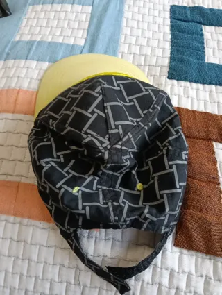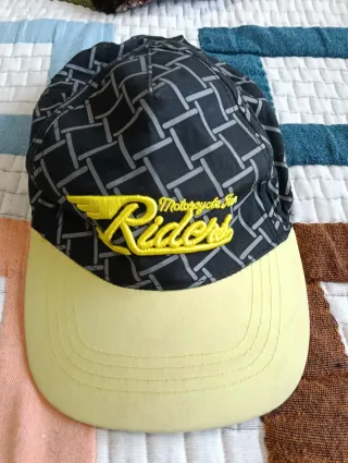 Gorra con diseño llamativo. - Estampado geométrico en negro. - Detalle bordado amarillo con alas y texto Riders. - Visera en tono amarillo.