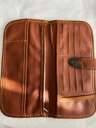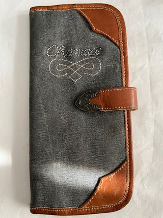 Billetera de tela con detalles en cuero. - Diseño tipo denim. - Cierre con broche metálico. - Bordado decorativo en la parte superior.