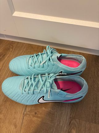 Botas de fútbol Nike Tiempo Legend 10 en color azul con detalles en rosa. - Diseño moderno y llamativo. - Logo de Nike en el lateral.