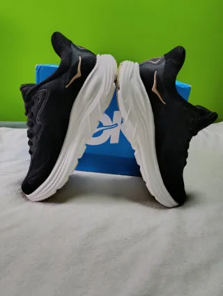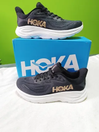 Zapatillas Hoka Clifton 10 en color negro con detalles dorados. -Estan nuevas, nunca se han usado. - Talla 44 (28cm) - Diseño moderno y llamativo. - Logotipo de Hoka en los laterales.