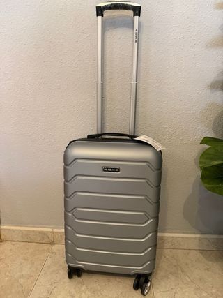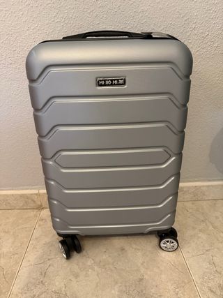 Maleta de cabina con un diseño moderno y elegante, nueva a estrenar. - Color plateado. - Marca Mikomika - Ruedas giratorias para fácil movilidad y desmontables.