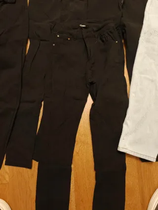 Lote de seis pantalones para mujer. - Tres pantalones negros. - Un pantalón blanco. - Un pantalón azul claro. - Un pantalón negro con raya lateral dorada.